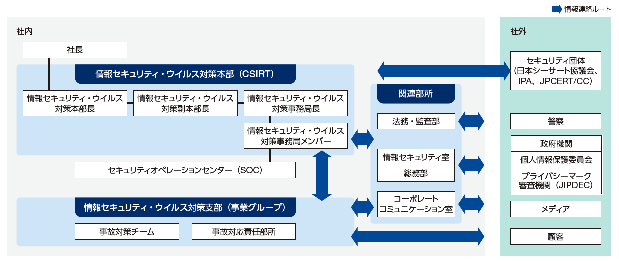 2005年4月、情報セキュリティ担当役員のもと、情報セキュリティに対する取り組みを全社的視点から組織的かつ効果的に企画・推進するために、「情報セキュリティ室」および「情報セキュリティ・ウイルス対策本部」を設置しました。また、全社の情報セキュリティ推進者を招集し、月に一度「セキュリティ委員会」を開催することで、情報漏洩防止を徹底しています。当社の情報セキュリティ関連規程はイントラネットにて全て社内公開し、特に重点項目については「情報漏洩防止12カ条」「個人情報漏洩防止7カ条」として社内に掲示し、周知・徹底しています。また、改正個人情報保護法およびGDPR(EU一般データ保護規則)などの法改正に対して、社内規程を見直し、管理体制と教育を強化して法令遵守に努めています。セキュリティ人財の育成、「セキュア開発・運用ルール」の策定・推進を行い、システム開発・運用のセキュリティ品質向上を実施しています。