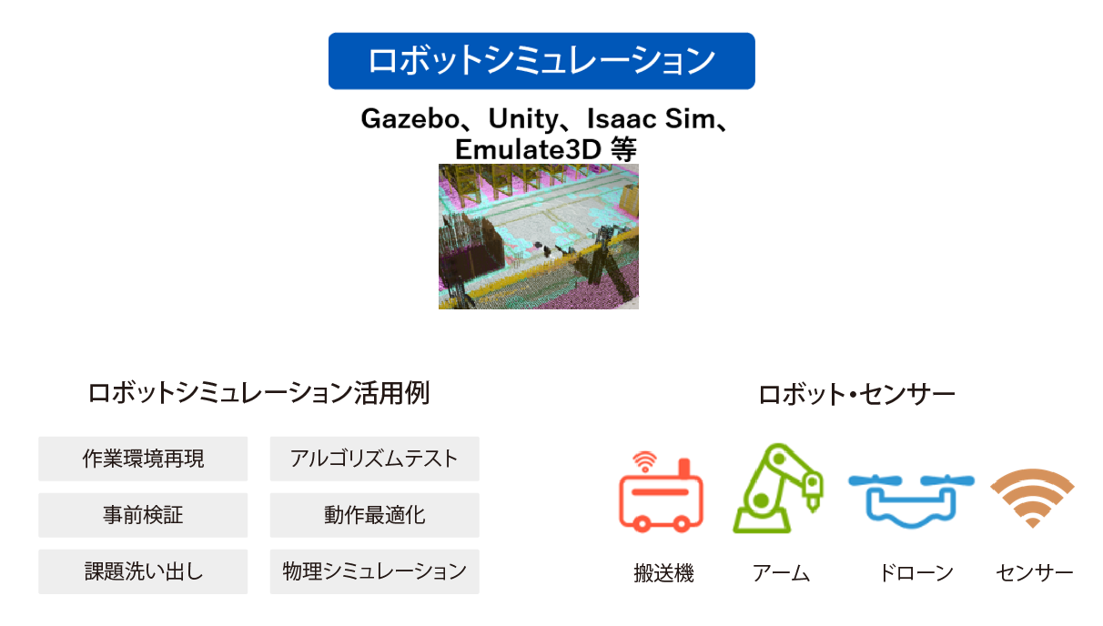 さらに、実際のセンサーデータやログをもとにしたリアルデータエミュレーションを行うことで、より現実に即した挙動検証が可能となり、ロボットシステムの構築・最適化にも対応可能です。これにより、現場導入前の精度向上やトラブルの予防に大きく貢献します。