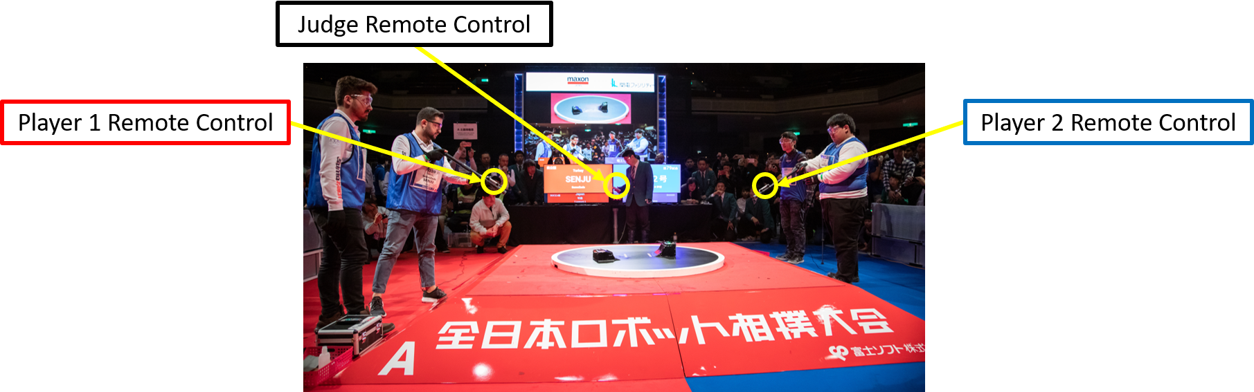 (1) An Autonomous type robot must be stopped by a Judge Remote Control or a player's remote control signal. The operation of the Judge Remote Control is performed by the judgment or the battle staff from Dohyo Jogai.