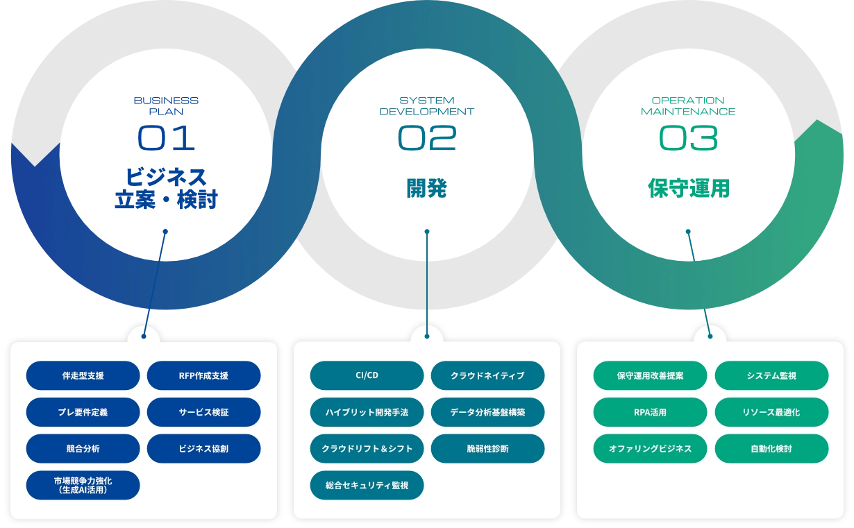 そして、そのビジネスモデルを支えるシステム開発、さらには安定した運用・保守まで、全てをワンストップで提供します。