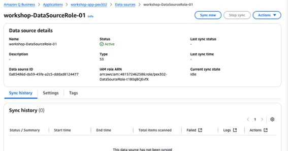 S3をデータソースの対象として、「Sync now」を押下して、データソースの同期を行います。