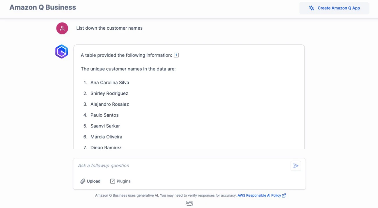 今回は「List down the customer names」と質問した結果として、顧客名の一覧が回答として出力されます。