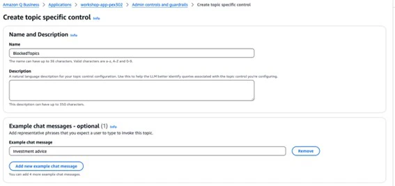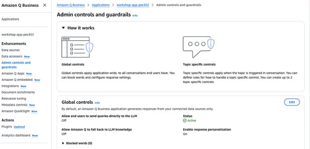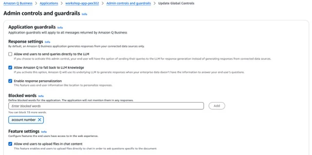 「Allow Amazon Q to fall back to LLM knowledge」を有効にして、「Blocked words」にて、[account number]など、アプリケーションのブロックする単語を定義します。