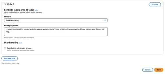 ブロック対象単語が入った質問に対する、デフォルトの回答を"I cannot complete ~ Admin for help."として、「Save」から保存します。