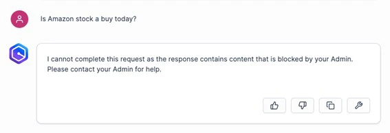 ガードレール設定後は、設定した通り、Investment adviceと判断され、"I cannot complete ~ Admin for help."という回答のみ出力されるようになります。