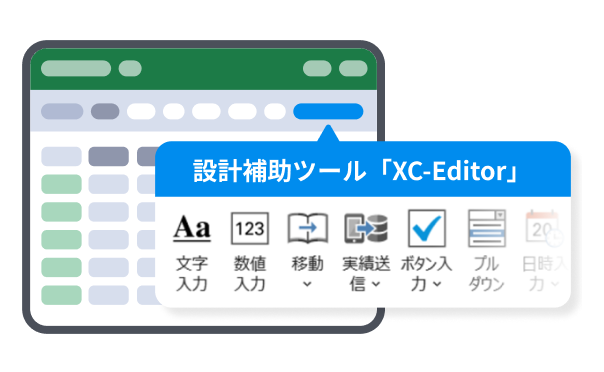 Excelのアドインとして、帳票作成をサポートする「XC-Editor」を無料でご用意しております。ボタン入力やプルダウンなどのアイコンを選ぶだけで、入力方式の自由な設計が可能です。XC-Gateに登録したマスタデータを、まとめて参照する機能も備わっています。