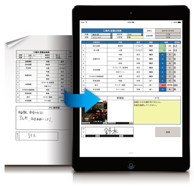 転記作業をゼロへタブレットなどの各種端末から入力した情報が、即座にデータベース化されます。データを登録した時点で収集から集計まで完結するため、事務所に戻ってからの転記作業や写真整理、承認ルートの確認などがすべて不要に。月150時間の作業削減につなげた事例もあり、全社的に業務効率化や省人化を進められます。