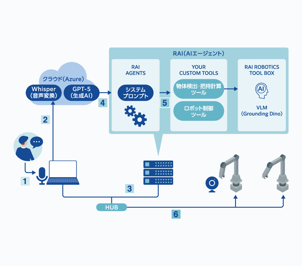 AIによるティーチングレスなロボット制御、音声認識によるハンズフリーティーチング。生成AI技術を活用することでティーチング作業にかかる課題を軽減します。ロボットをより身近にします。