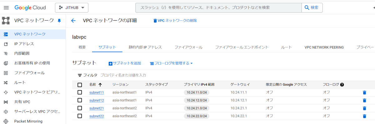 次に、東京 (asia-northeast1) と大阪 (asia-northeast2) の各リージョンに、サブネットを2つずつ作成します。