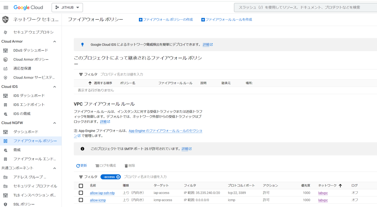 VMインスタンスへの通信を許可するため、ファイアウォールルールを作成します。今回は、セキュアなリモート接続を実現する IAP (Identity-Aware Proxy) からの通信と、疎通確認のためのICMP通信を許可します。