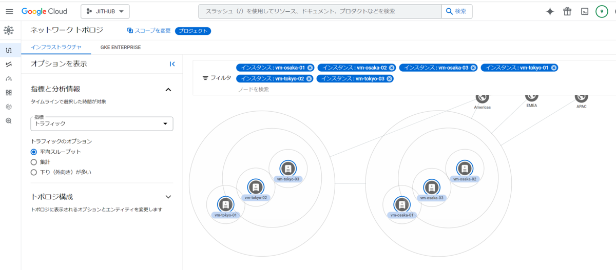 Google Cloud Console の Network Topology という機能を使うと、VPCネットワーク内のトラフィックやリソースの構成を視覚的に確認できます。今回構築したリソースが、意図した通りに各リージョン・ゾーンに配置されていることが一目でわかります。