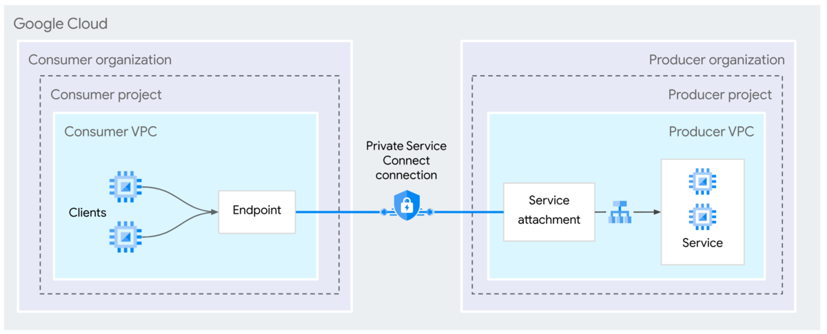 PSC公開サービスは、あるプロジェクト(プロデューサー)内の内部ロードバランサを、別のプロジェクト(コンシューマー)からプライベートに利用できるようにする仕組みです。プロデューサーはサービスを「サービスアタッチメント」として公開し、コンシューマーはVPC内に「エンドポイント」を作成してそのサービスに接続します。