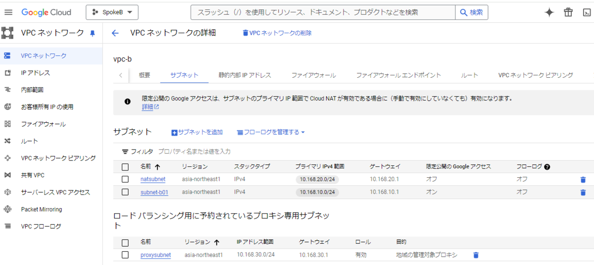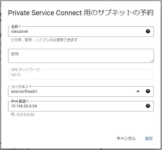 PSC用のNATサブネットを予約します。このサブネットのIPアドレスは、コンシューマーからのトラフィックをバックエンドのVMへ転送する際に、送信元NATとして使用されます。