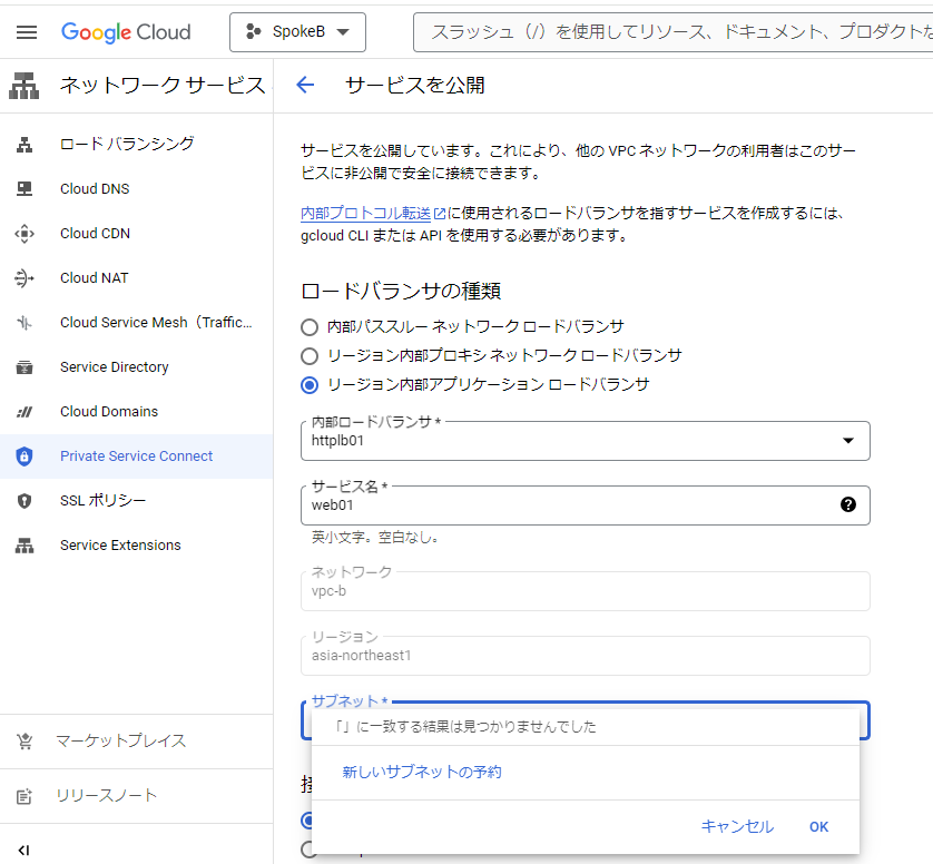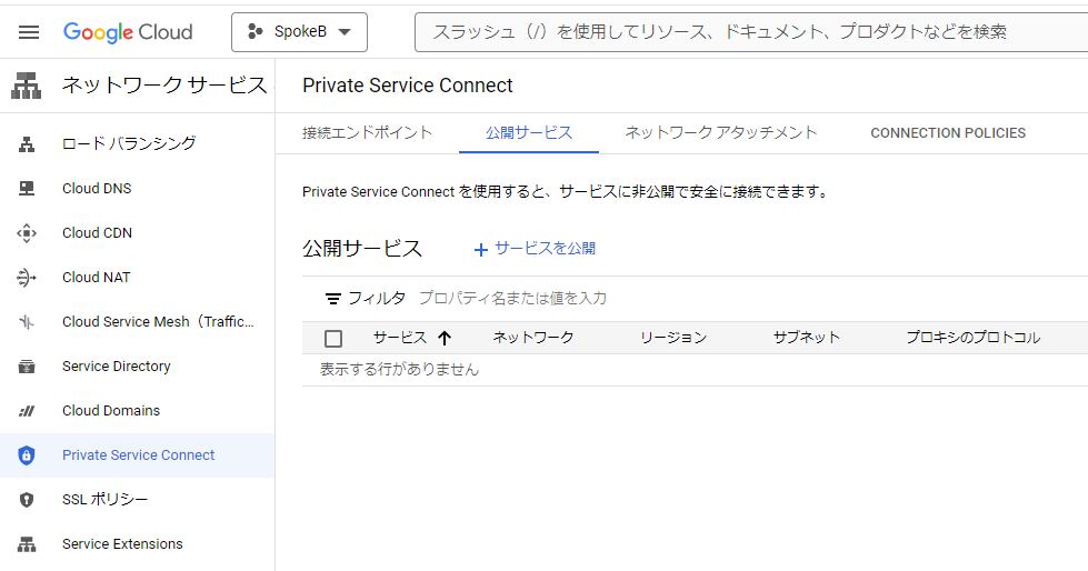 SpokeBプロジェクトの[Private Service Connect] - [公開サービス]画面で、[+サービスを公開]を選択します。