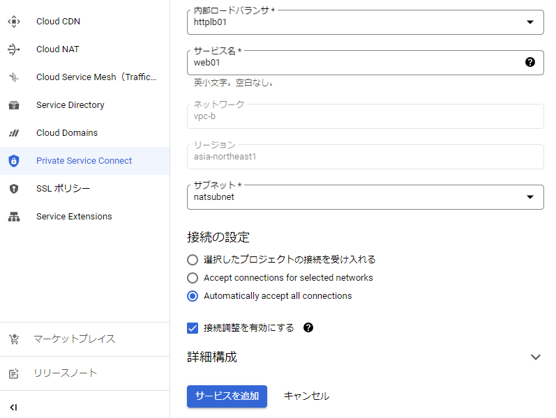 接続設定(今回は全接続を自動承認)を選択し、サービスを追加します。