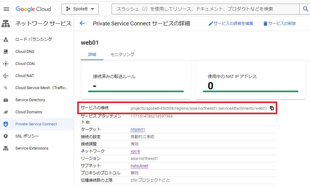 作成後、**サービスの接続情報(サービスアタッチメントURI)**をコピーしておきます。これがコンシューマー側からの接続先ターゲットになります。