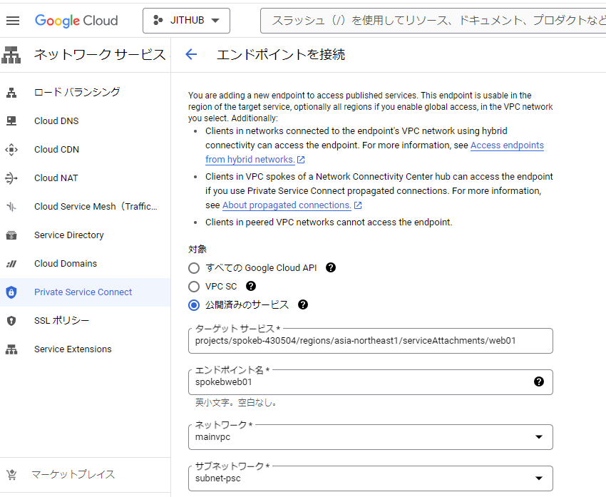 サービス提供側であるSpokeBプロジェクト(プロデューサー)で公開されているWebサービス(内部ロードバランサ)に対し、サービス利用側のJITHUBプロジェクト(コンシューマー)を経由して、オンプレミス環境からプライベートにアクセスする構成を構築します。