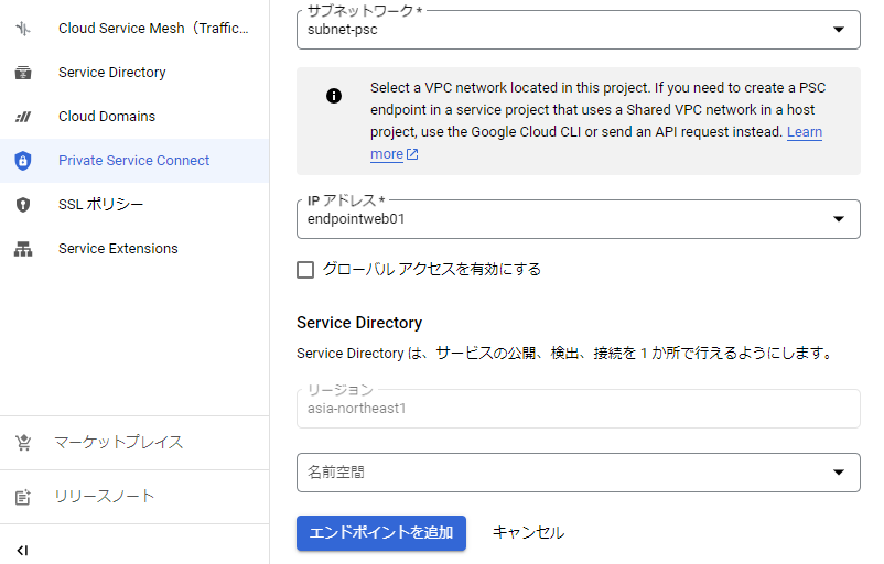 Google API接続: エンドポイントのIPは、VPC内のどのサブネットとも重複しないアドレス空間から指定しました。
