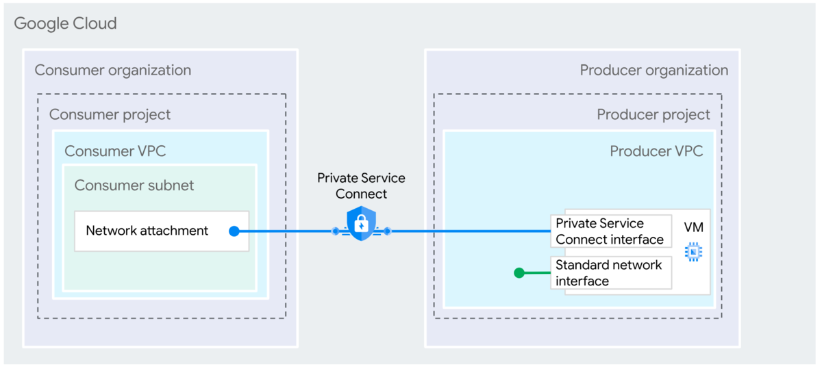 PSCインターフェースは、プロデューサーVPCに属するVMインスタンスに、**2つ目のネットワークインターフェース(NIC)**を追加する機能です。この2つ目のNICには、コンシューマーVPCのサブネットからIPアドレスが割り当てられます。