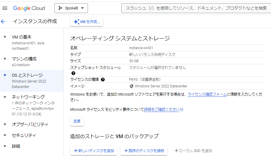 SpokeBプロジェクトで、通常通りVMインスタンスの作成を開始します。