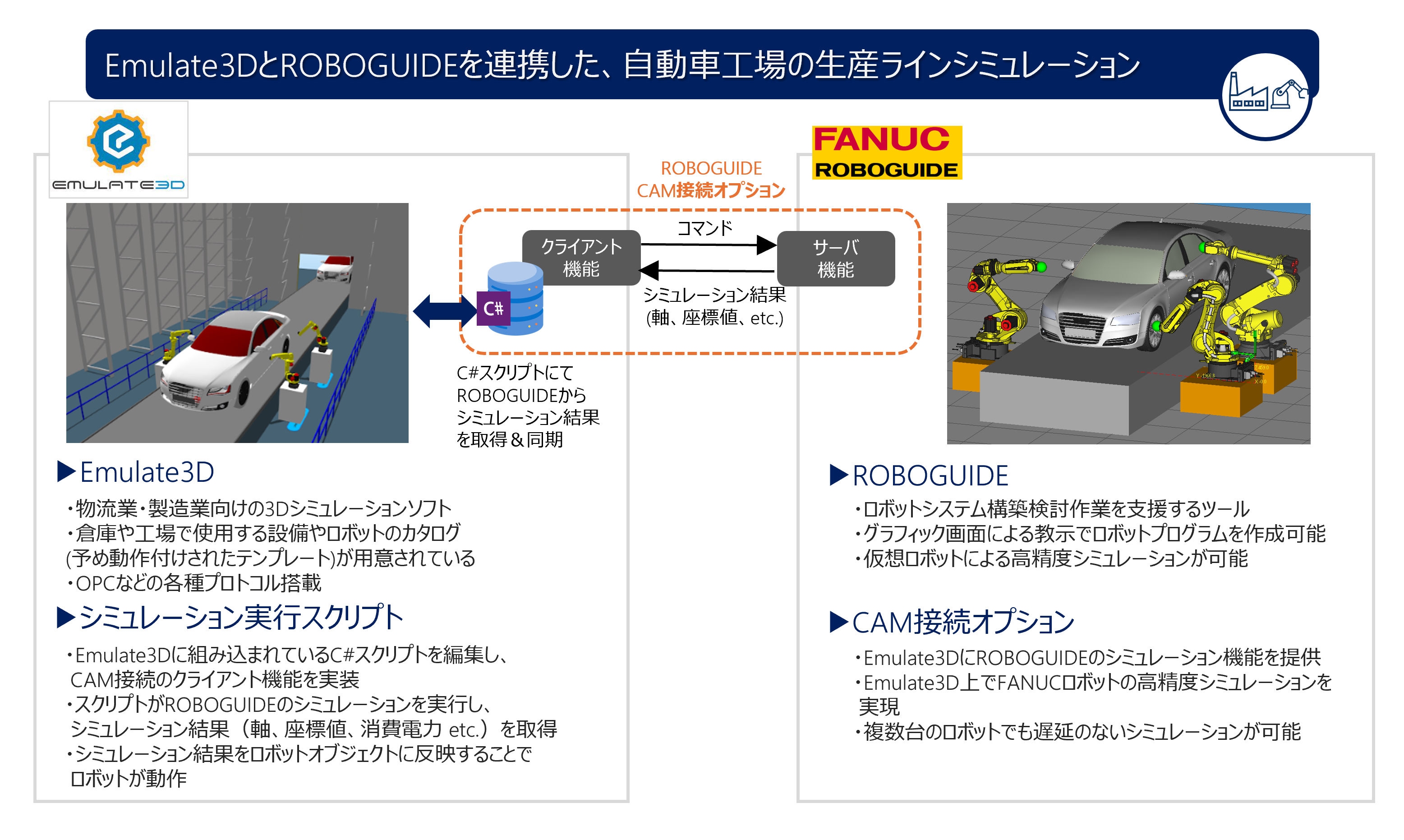 FANUC社製のロボットシミュレーターROBOGUIDEとEmulate3Dを連携させることで、極めて実機のロボットに近い自然な動作をEmulate3Dでシミュレートすることが可能になりました。
