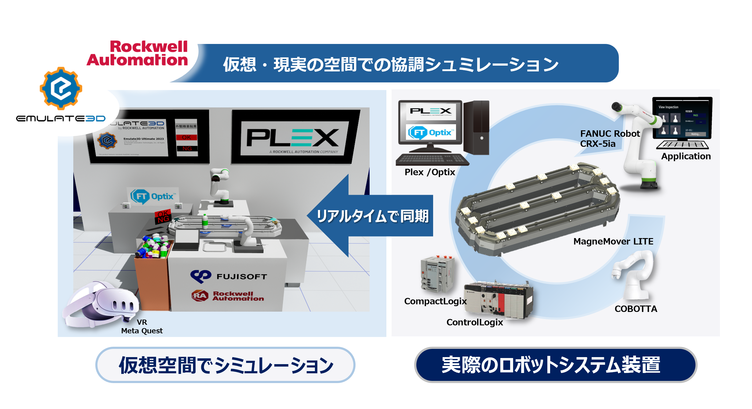 産業用協働ロボット2台(FANUC CRX-5iA,DENSO Cobotta)、MagneMover LITEの実際の動作をリアルタイムに同期し、Emulate3Dでシミュレーションを展示しました。設計段階では外観検査設備を構築するために必要な設備設計や