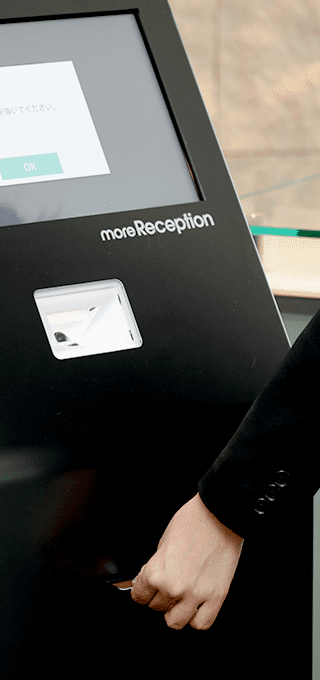 moreReceptionは、担当者名や部署名検索により内線通話ができるシンプルな受付タイプから、QRコード受付、入館カード発行を行う受付タイプまで、様々な受付に対応できます。端末に触れることなく受付手続きが完了するタッチレス受付もご提供可能です。>>タッチレス受付の詳細はこちら