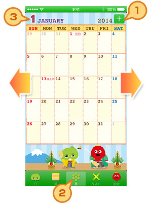 前月や来月の予定を見たいときは、紙の手帳と同じ感覚で左右に指をすべらせるだけ♪