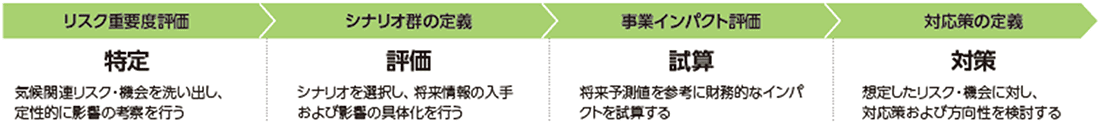 「サステナビリティ推進委員会」では、気候関連を含むサステナビリティ課題(リスクおよび機会)について審議を行っており、特に気候関連リスクおよび機会については、外部評価機関からの設問なども参考に、シナリオ分析を用いながら短・中・長期の時間軸および発生可能性や将来予測値(パラメータ)を踏まえたうえで、定性・定量の両面からリスクおよび機会の識別・評価を行っています。
