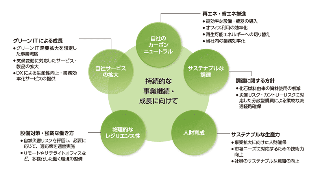 | 技術投資 | 脱炭素社会への移行に対応し、グリーンITへの投資・開発に適応した場合、他社への顧客が流出阻止だけでなく、新たな収益機会が増加する | 短期~長期 | 大 | ー | ||