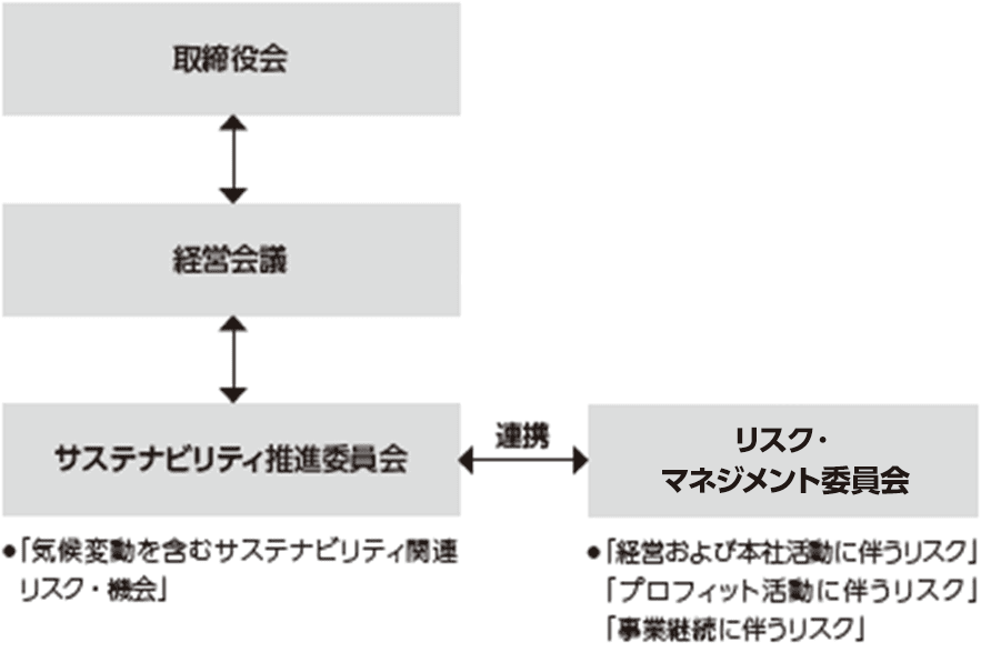 当社では気候関連を含む事業活動に伴うリスクおよび機会について、「サステナビリティ推進委員会」が識別・評価を行い、全社的なリスク管理を行う「リスク・マネジメント委員会」と連携して、管理を行っています。