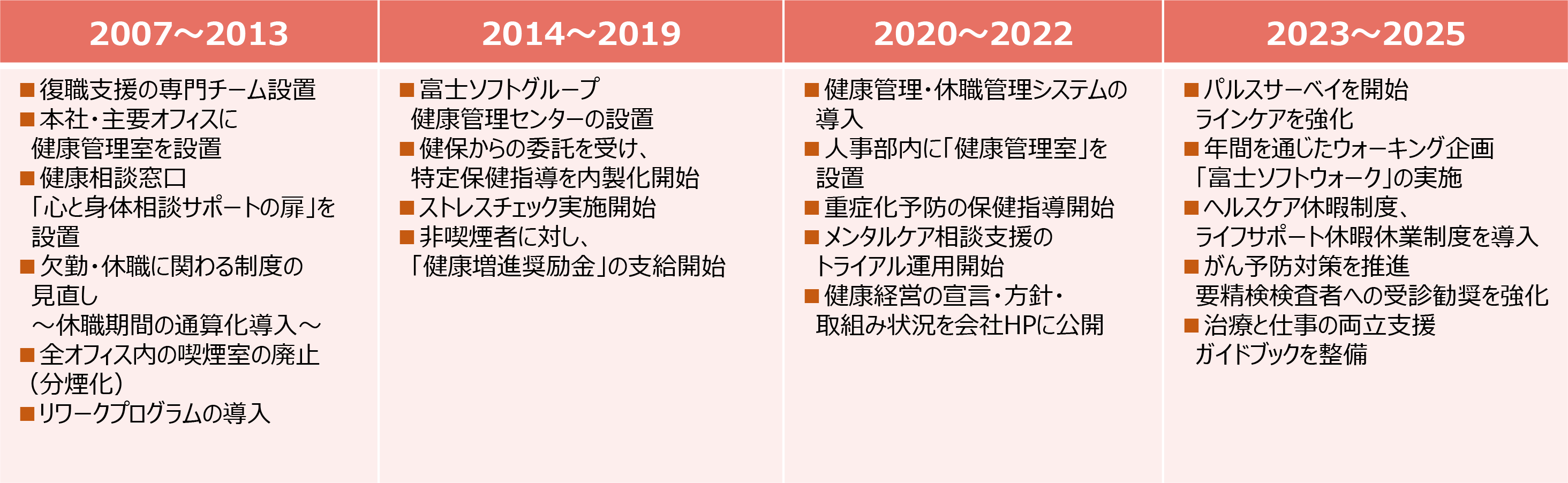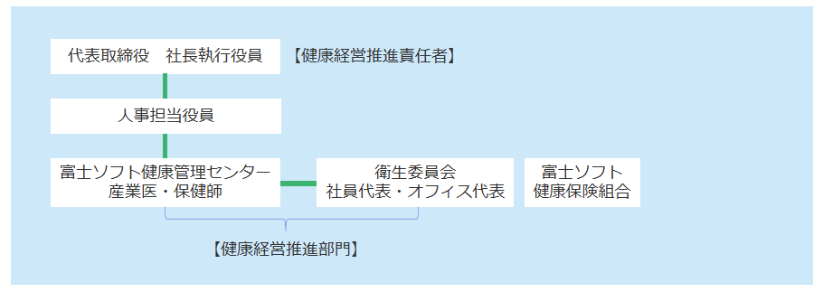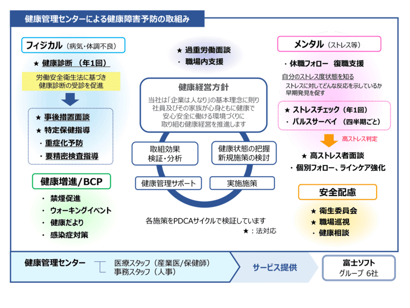 当社は、2007年から本社・秋葉原にヘルスケアルームを設置して全拠点の産業保健活動の統括管理を開始。2014年4月からは、グループ各社の健康管理業務を集約、適用範囲をグループ会社社員にも拡大、サービスレベルを統一して健康管理を行うことを目的に「富士ソフトグループ健康管理センター」を設置して健康管理体制を整え、健康管理、予防推進の取り組みを行っています。