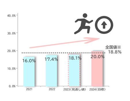 | 朝食摂取率 | 健康診断の問診票で、週4日以上朝食をとると回答した割合 | 58.2% | 55.5% | 55.3% | 56.0% |