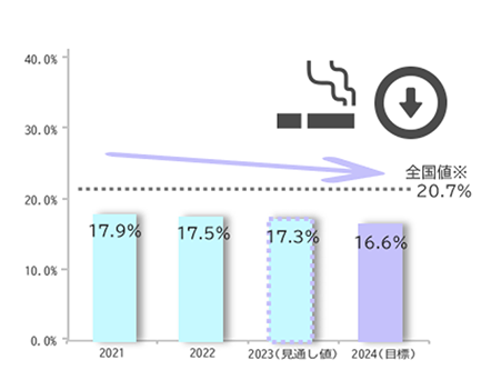 ※全国値(運動習慣率・喫煙率):2019年(令和元年) 国民健康・栄養調査 20~59歳までの集計値より抜粋