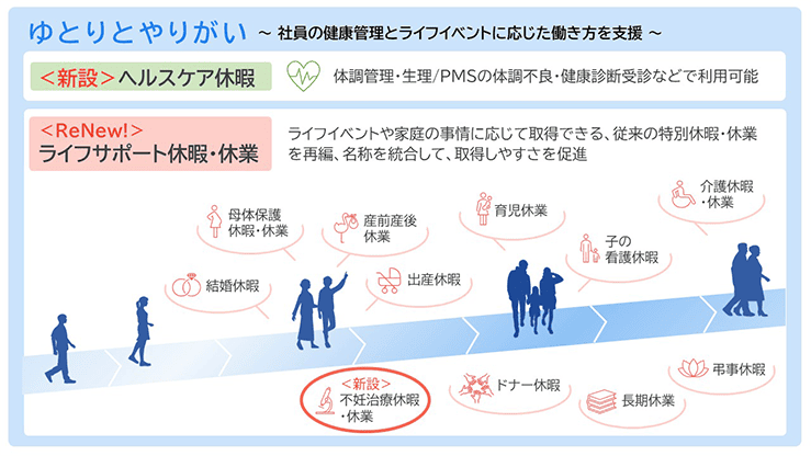 育児、介護などの従来の休暇・休業制度に不妊治療休暇・休業を加えて再編、社員の生活やライフイベント、家庭の事情に応じて取得できる休暇・休業を「ライフサポート休暇・休業」として総称、社員のプライバシーに配慮するとともに、取得しやすさ・ワークライフバランスの充実を実現しました。