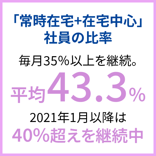 基本方針に掲げる「ゆとりとやりがい」の実現に向け、社員の柔軟な働き方をバックアップする「コアタイム」なしのフレックスタイム制度を基本の働き方としています。社員の事情に応じた多様な働き方を推進するなかで、在宅勤務の環境を整備し、テレワークを推進してきました。さらに、短縮勤務制度、裁量労働制度を導入しており、社員が様々な制度を活用し、個々のライフスタイルに合わせた多様な働き方ができるよう支援しています。また、生産性向上を意識し、残業時間削減やフレキシブルに取得できる有休制度などの働き方改革を行い、仕事と生活の調和を目指して、社員一人ひとりが元気に働ける職場環境の実現に取り組んでいます。