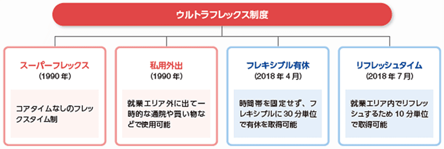 2018年4月に半日有休を時間帯を固定せずフレキシブルに取得可能とする「フレキシブル有休制度」、さらに2018年7月には、業務中のリフレッシュタイムを10分単位で認める「リフレッシュタイム制度」を導入しました。これらにより、これまでの「スーパーフレックス(1990年より導入しているコアタイムのなしのフレックスタイム)」を超える「ウルトラフレックス制度」がスタートしました。社員一人ひとりの働き方に柔軟に対応できる勤務制度は「ゆとりとやりがい」の拡充につながり、社員の社会活動拡大や女性の活躍促進、持続的成長を支える付加価値の創出となって、社会の発展に貢献しています。