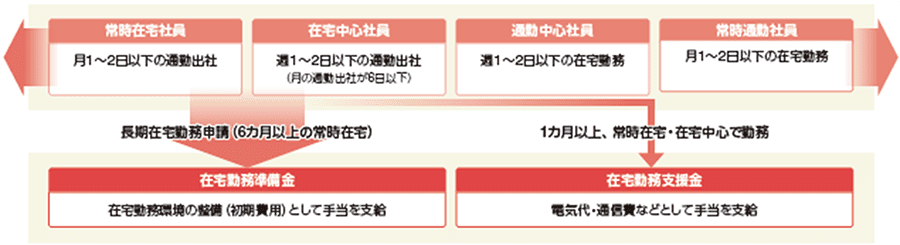 2020年4月の緊急事態宣言より遡ること2カ月前から、新たな働き方改革として常時在宅勤務の推進に取り組んできました。当社は働き方のイメージを以下の4つのパターンとして定め、在宅中心で勤務する社員向けに「長期在宅勤務申請」「在宅勤務準備金」「在宅勤務支援金」制度を2020年4月1日より導入しました。