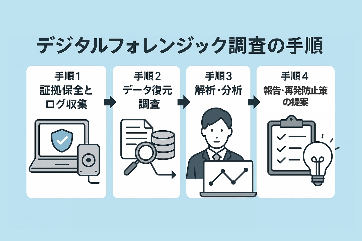 デジタルフォレンジック調査は、サイバー攻撃や情報漏洩といったトラブルに対処するために欠かせないプロセスです。調査の具体的な流れや手順を知りたい方に向けて、基本的なステップから詳細な手法までを解説します。